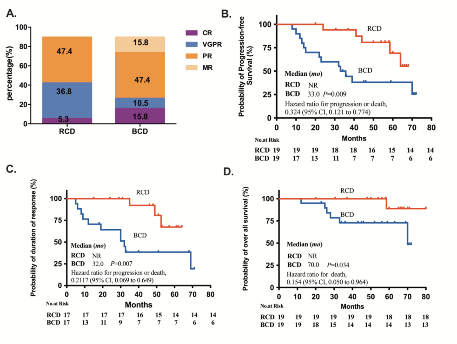 研究显示两种患者主要有效率相似(89.5% vs 73.7%,P=0.209),总有效率相同(均为89.5%)。但患者在RCD组获得较好部分缓解的情况略优于BCD组(42.1% vs 26.3%,P=0.305)。中位随访55个月,RCD组患者中位反应持续时间(未达到 vs 32个月,P=0.007)、无进展生存(未达到 vs 33个月,P=0.009)及总生存(未达到 vs 70个月,P=0.034)均优于BCD组患者。微小残留病灶分析显示使用BCD方案治疗的患者残留更多的异常淋巴细胞及异常浆细胞,提示单纯抗浆细胞治疗无法有效清除患者肿瘤细胞。