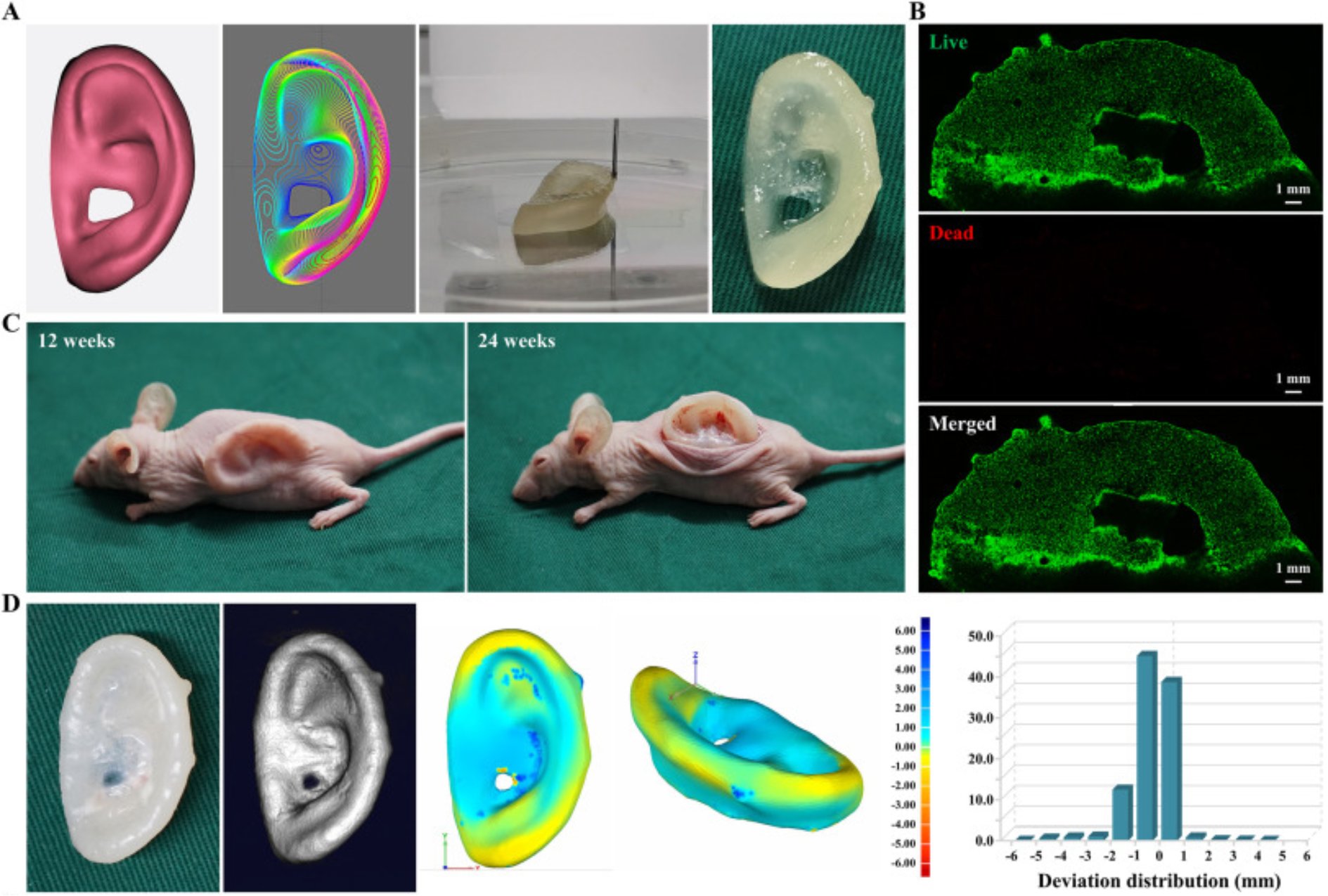 耳廓作为人体面部的主要特征之一,耳廓发育畸形或缺损会严重影响患者的外观及功能,对患者的身心健康造成严重影响。临床常用的耳重建方法主要是自体肋软骨耳支架,但存在创伤较大、对术者耳支架雕刻技术要求较高,且有胸廓畸形的可能。组织工程技术为耳廓重建提供了一种有前景的治疗策略。近年来,3D生物打印技术的兴起为组织工程提供了更先进的手段,可以实现细胞和材料的精确空间分布,在组织和器官的仿生构建中具有显著的应用优势。天然水凝胶类材料因具有良好的生物相容性和可打印性逐渐成为3D生物打印墨水的研究热点。该研究团队针对传统水凝胶成分单一难以模拟软骨微环境,质地致密限制细胞行为以及力学性能差难以维持精确三维形态等技术瓶颈,研制了基于软骨脱细胞基质的光敏水凝胶仿生软骨特异性微环境,应用聚环氧乙烷产生微孔结构促进细胞行为和软骨形成,引入高强度和慢降解的聚己内酯形成支撑框架,整合多喷嘴3D生物打印技术,精确控制载软骨细胞生物墨水和支撑材料的分布,制备了精确形态和良好力学性能的耳廓构建物,并在体内再生为形态保真度高、弹性好、有丰富的软骨特异性细胞外基质沉积的成熟耳廓软骨样组织。