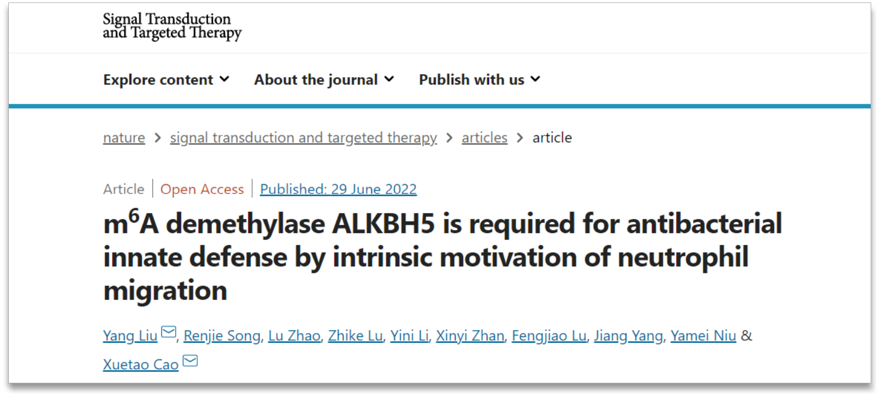 2022年6月29日,太阳成集团tyc122cc入口基础医学研究所暨太阳成集团tyc122cc入口免疫治疗研究中心曹雪涛院士团队在Signal Transduction and Targeted Therapy杂志发表了题为“m6A demethylase ALKBH5 is required for antibacterial innate defense by intrinsic motivation of neutrophil migration”的研究论文。研究报道了alkB同源物5 RNA去甲基化酶(alkB homolog 5 RNA demethylase,ALKBH5)在机体抗菌免疫防御过程中发挥着至关重要的作用,首次揭示了中性粒细胞ALKBH5及N6-甲基腺嘌呤(N6-methyladenosine,m6A)RNA修饰可以调控其迁移能力的表观新机制。