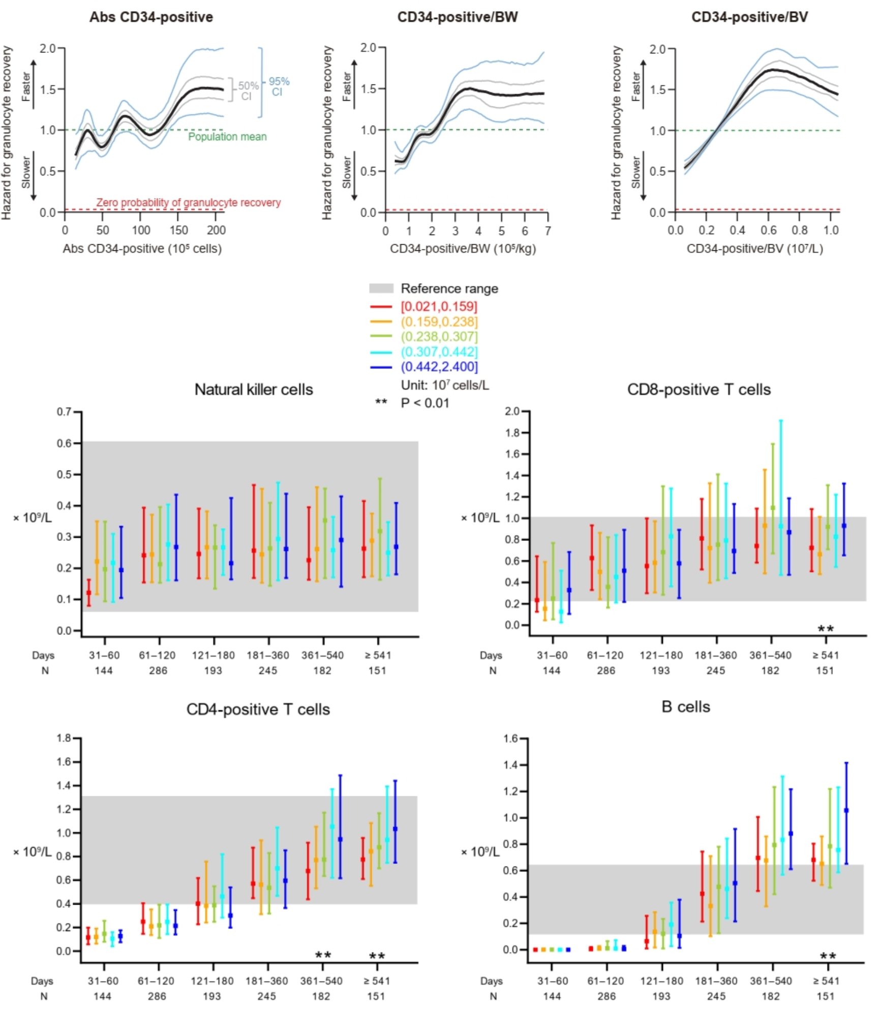 该研究也发现,CD34+细胞以受者每升血液剂量能最好地解释移植后初期外周血中粒细胞数目增长的动力学。CD34+细胞剂量每递减一半,粒细胞数目的恢复时间就平均延迟1.6天,但延迟植入并不影响移植后的免疫重建、复发率或生存率。该研究提示在移植技术的不断进步及移植后全程管理水平比过去更先进的情况下,我们应重新审视过去制定的CD34+细胞剂量标准是否仍合适。