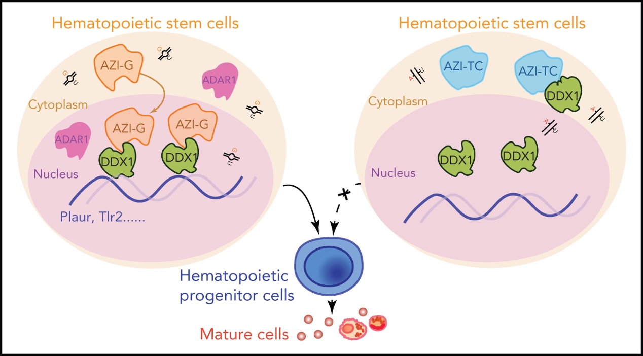 RNA编辑事件普遍存在于生物体内,是遗传信息传递过程中重要的转录后调控方式之一,主要由RNA编辑酶ADAR家族成员所介导。在造血系统中主要发挥功能的RNA编辑酶是ADAR1。ADAR1敲除的小鼠,由于红系发育基因缺少RNA编辑,胎肝发育停滞,胚胎于13.5天死亡。2009年血研所程涛教授和匹兹堡大学王庆德教授合作发现在小鼠的成体造血祖细胞(HPC)分化过程中,ADAR1在造血祖细胞中表达丰度最高。ADAR1敲除后,由于缺少RNA编辑,HPC凋亡明显增加,增殖分化障碍,体外集落形成能力明显下降,重建造血功能障碍。造血干细胞比例相对升高,祖细胞数量显著减少。同时,还发现了ADAR1的缺失引起早期T细胞发育障碍。但是目前关于RNA编辑如何调控造血分化的机制仍不明确。