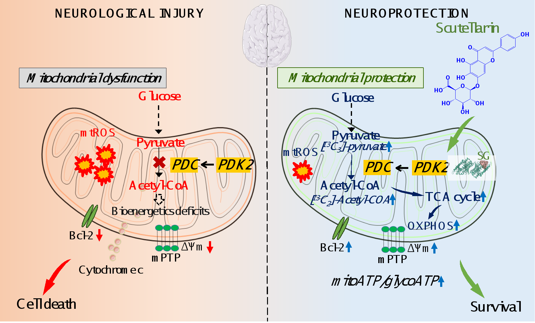 图. 灯盏乙素靶向调控PDK2-PDC轴影响线粒体葡萄糖氧化代谢发挥神经保护作用