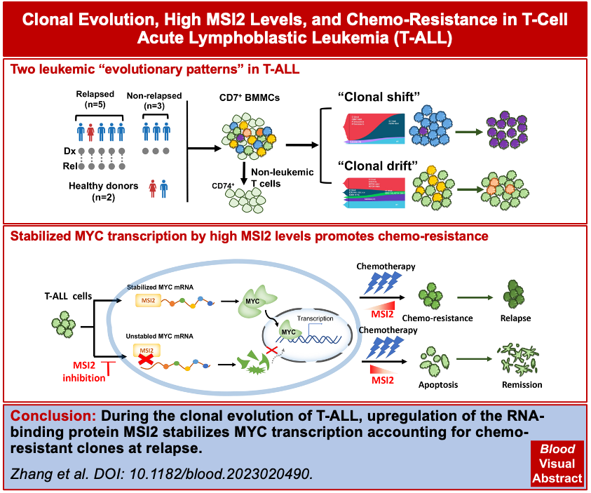 2023年10月6日,竺晓凡/张英驰团队在Blood《血液杂志》在线发布了题为“Clonal Evolution Dissection Reveals High MSI2 Level Promotes Chemo-resistance in T-cell Acute Lymphoblastic Leukemia”(急性T细胞淋巴细胞白血病克隆演化模式研究揭示MSI2参与化疗耐药机制研究)的研究论文。此研究利用单细胞多组学技术解析了儿童急性T细胞淋巴细胞白血病(T-ALL)的白血病克隆演化模式,揭示了克隆演化过程中RNA结合蛋白MSI2通过调控癌基因MYC表达诱导化疗耐药的分子机制。