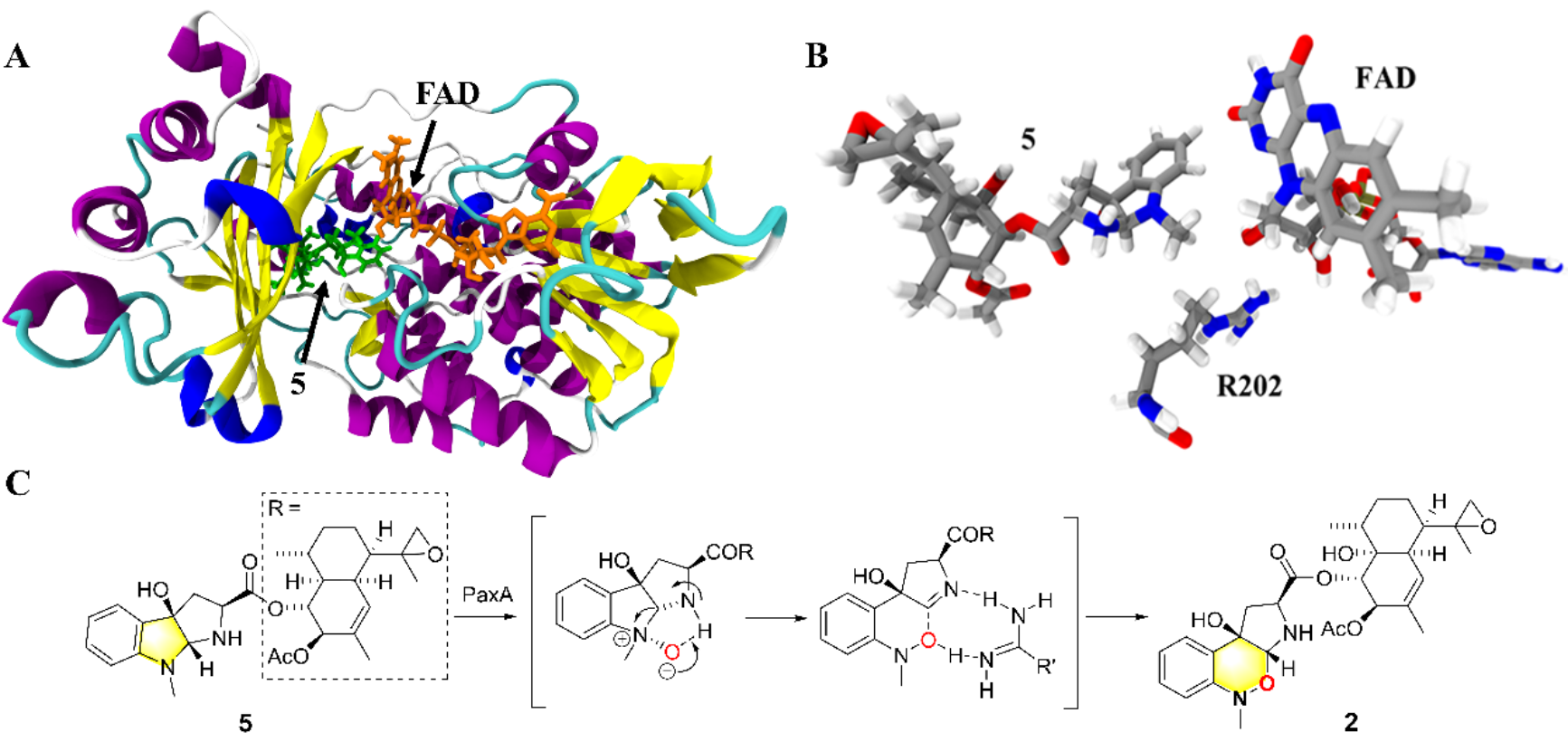 图:A.PaxA与底物5的分子对接结果;B.FAD、底物5与R202之间的相对位置;C.PaxA催化1,2-噁嗪环的酶促机制