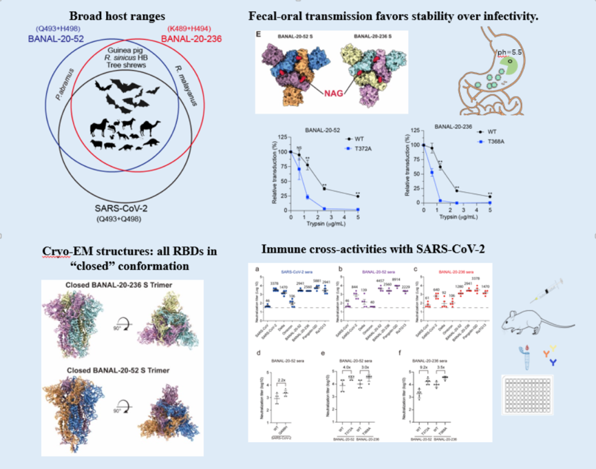 2023年7月28日,太阳成集团tyc122cc入口病原生物学研究所钱朝晖团队和中国科学院生物物理研究所王祥喜团队合作在Cell Discovery《自然发现》期刊上发表了题为“Host susceptibility and structural and immunological insight of S proteins of two SARS-CoV-2 closely related bat coronaviruses”(两种新冠样蝙蝠冠状病毒S蛋白的宿主易感性、结构以及免疫学研究)的研究论文,对2种于2020年在老挝发现的、与SARS-CoV-2高度同源的蝙蝠冠状病毒BANAL-20-52和BANAL-20-236 S的潜在宿主范围、S蛋白的结构以及免疫特征进行了较系统的研究。