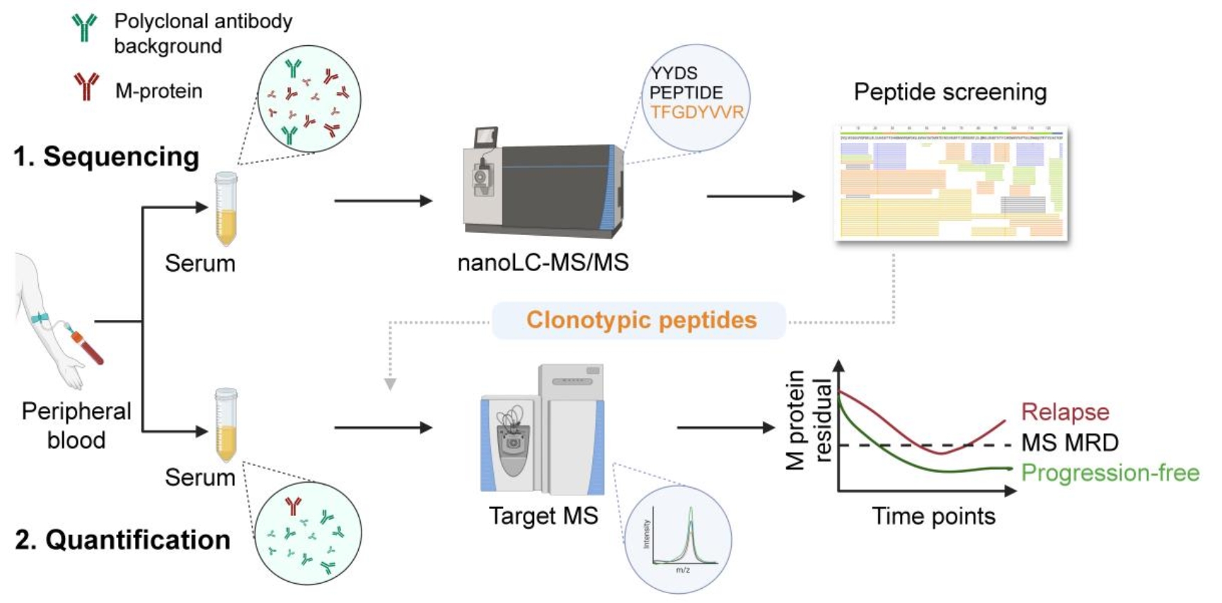 该研究纳入了国家血液病纵向队列-多发性骨髓瘤子队列中56例新诊断MM患者,通过对患者的初诊及序贯血清样本进行easyM MS检测(一种蛋白质谱检测方法),发现easyM MS可识别个体特异的MP序列,实现了对MM患者血清MP的高敏感度靶向定量监测,并可提前预测疾病复发/进展。