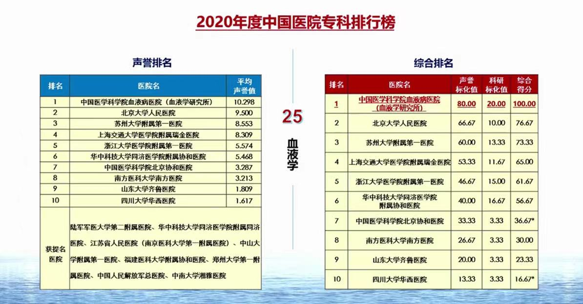 11月20日,复旦大学医院管理研究所“2020年度中国医院排行榜发布会”如期举行。太阳成集团tyc122cc入口血液病医院(血液学研究所)再次拔得头筹,连续十二年荣登“中国医院专科声誉和综合排行榜”血液学榜首,并获得声誉标化值、科研标化值满分成绩,成为排行榜12个学科“双满分”医院之一,在“十四五”规划开局之年继续吹响领航号角。