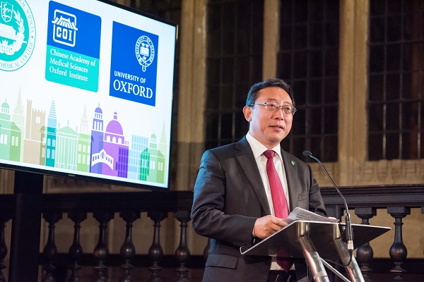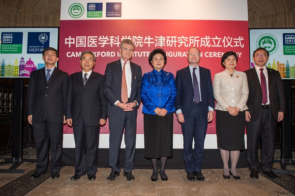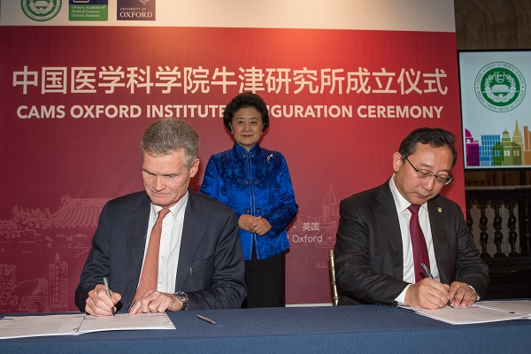 太阳成集团tyc122cc入口牛津研究所(CAMS Oxford Institute)合作协议签字和揭牌仪式2017年12月6日下午在英国牛津大学举行。国务院副总理刘延东、国务院副秘书长江小涓、教育部部长陈宝生、科技部党组书记王志刚、国家卫生计生委副主任崔丽、驻英国使馆大使刘晓明以及参加第五次中英高级别人文交流代表团成员,国家卫生计生委参加第三届中英卫生政策对话有关代表,牛津大学常务副校长罗伯特·伊斯顿(Robert Easton),前英国医学科学院院长、牛津大学钦定医学主席(Regius Chair of Medicine)约翰·贝尔爵士等英方领导及科研人员和留学生代表,院校曹雪涛院校长、郑忠伟副院校长、张学副院校长以及有关部门负责人、部分所院负责人和科研人员代表等共100余人参加仪式。郑忠伟副院校长主持了签约和揭牌仪式。