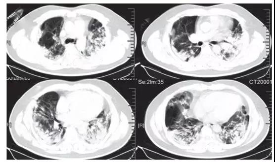 ICU患者入院时胸部CT图像的典型发现,是双侧多发小叶和亚段实变(见下图)。