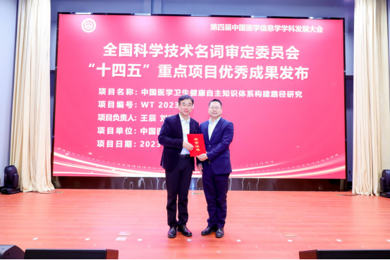 大会发布了全国科学技术名词审定委员会“十四五”重点项目“中国医学卫生健康自主知识体系构建路径研究”的优秀成果并颁发证书。全国科学技术名词审定委员会裴亚军常务副主任向该项目承担人王辰院士授予“优秀成果”证书,祝贺王辰院士及团队在我国自主知识体系领域取得了丰硕成果。该项研究构建了中国医学卫生健康自主知识体系框架,加强卫生健康科技信息标准化,促进国际医学学术合作。