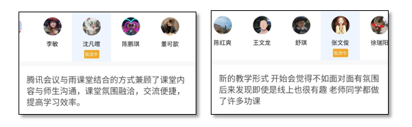 为保障同学们的学习效果,社区护理学系教师们兼顾多个平台优势,紧密衔接课前-课中-课后三个环节。课前,老师们收集文献、视频、教材资源在雨课堂平台发布,帮同学们预热,扩展知识面。课中,老师们把握当下社区防控工作的鲜活学习素材,兼顾雨课堂、腾讯会议、腾讯课堂等系统中的投票、答题、弹幕、投稿、视频播放等功能,引导同学们将自己观察和感受到的社区卫生服务工作带到课堂分享、讨论,激发同学们的学习兴趣和参与度,帮助同学们快速地适应和融入到了《社区护理学》线上课堂中,学习氛围融洽。课后,老师们在雨课堂和微信群发布思考题和测试题,帮助同学们强化课堂学习效果,利用讨论区,交流思想。
