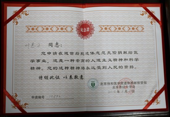 叶惠方教授遗体捐赠纪念证