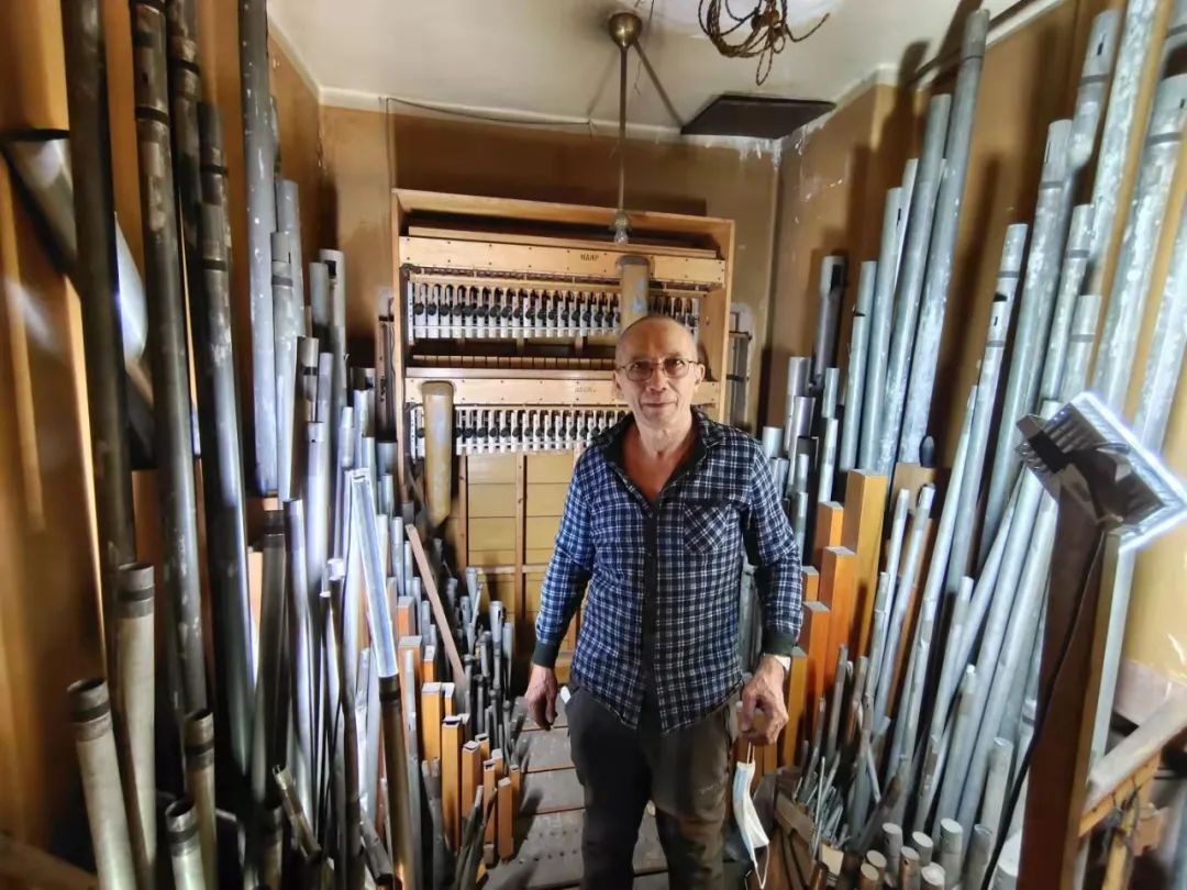 两人此前在全国的音乐厅、教堂、学校都有安装和维护管风琴的经历,但是见到如此“高龄”的管风琴,还是第一次。驻京数十年的法属波里尼西亚人张仕良,带着一点北京腔说,“之前我维修过一台拥有七八十年历史的德国管风琴,但是上百年的琴我还是头一次见到,我真的很喜欢它。我要像对待一件文物一样去完成拆卸工作。”在张仕良看来,这台琴记载着古老历史,“它有一种古老的精神在,如果修复了,还是历史的感觉,如果安一台新的琴,历史感就没了,不是吗?”张仕良拿起一根音管吹了吹,和尘土一起飞扬的,还有轻灵悦耳的声音。“很棒哦,音还在。”在风铃竖琴机械部分,印有“513和1920”两组数字。刘恒汐推测,“1920年”代表琴安装的年代,“513”则是1920年原厂家Kimball在当年生产安装的第513台管风琴。
