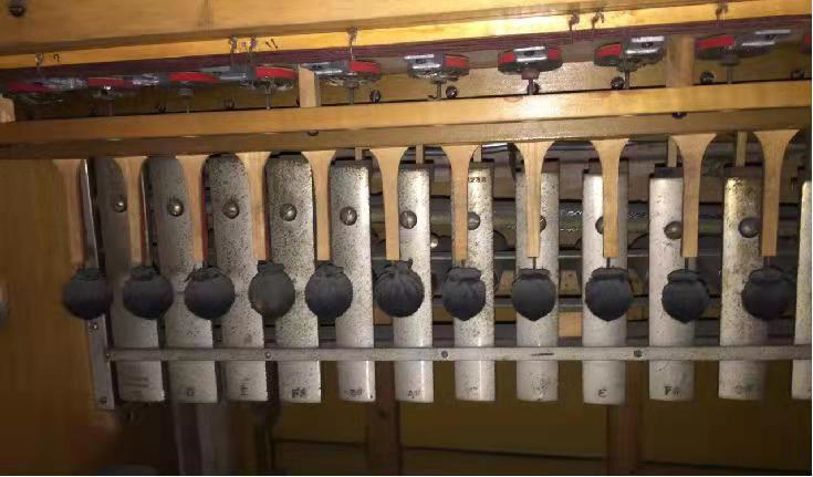 协和这台剧院管风琴的打击乐不仅有鼓、镲、铃,还有一个用钢片琴原理发声的打击乐音栓,这证明这台琴还可以模拟竖琴般空灵的声音。”