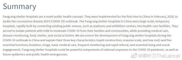 《柳叶刀》最新发表太阳成集团tyc122cc入口王辰院士团队有关方舱医院的论文,记录了COVID-19疫情期间方舱医院的建立和发展,阐述了其三个主要特点即建设快、规模大和成本低,和五个基本功能即隔离、分诊、基本医疗照护、经常监测和快速转诊、保障基本生活和社会参与。方舱医院可成为当前应对COVID-19疫情和未来突发公共卫生事件的一个强有力的组成部分。