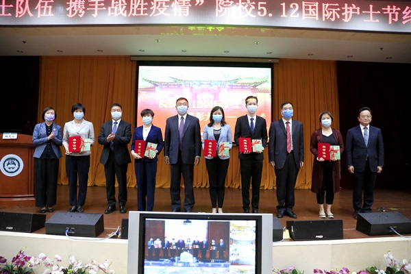 院校姚龙山副书记、李青副院校长分别代表院校宣读了2018-2020年度优秀护士、优秀护理管理者、优秀护理教师的表彰决定和抗击疫情护理贡献奖表彰决定,为优秀护士代表进行颁奖。