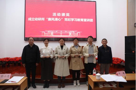 经现场评比,选出一二三等奖4名,优秀奖4名。彭小忠所长、邓巍书记为获奖选手颁发奖杯。石英杰、姚楠、程陈恩泽、姜林成为动研所纪委“廉风清心”党纪学习教育宣讲团成员,郭建国、苏磊、李祥磊、安歆加入宣讲团后备队伍。