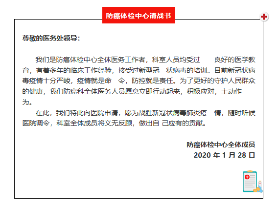 关键时刻,关键在党。面对突如其来的疫情,放疗科全体放疗人积极行动起来。放疗科党支部第一时间成立疫情应急响应小组,党员们随时听从组织召唤,哪里需要就到哪里去!党员万宝同志说:“此时此刻,我要向党组织,各级领导请战,我自愿申请加入医疗队从事力所能及的工作,服从安排,听从指挥!”