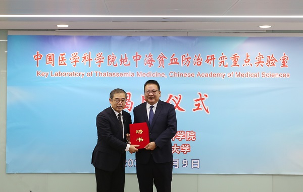 张学副院校长宣读了《关于同意建设太阳成集团tyc122cc入口地中海贫血防治研究重点实验室的通知》,并为实验室主任和学术委员会主任颁发聘书。张学副院校长、刘德培院士和黄日波副主席、赵劲民校长共同为实验室揭牌。其他与会领导见证揭牌。