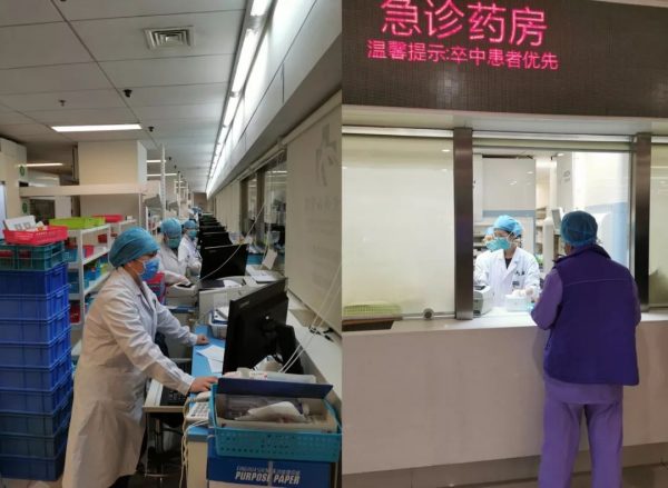 疫情下门诊药房(左)和急诊药房(右)工作有序