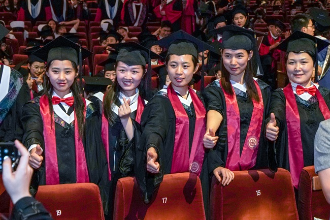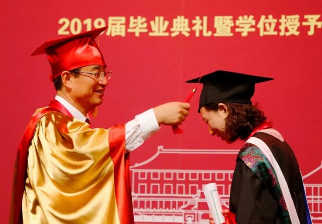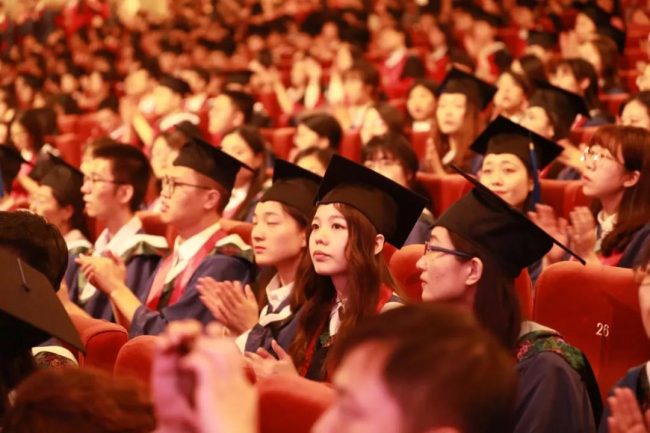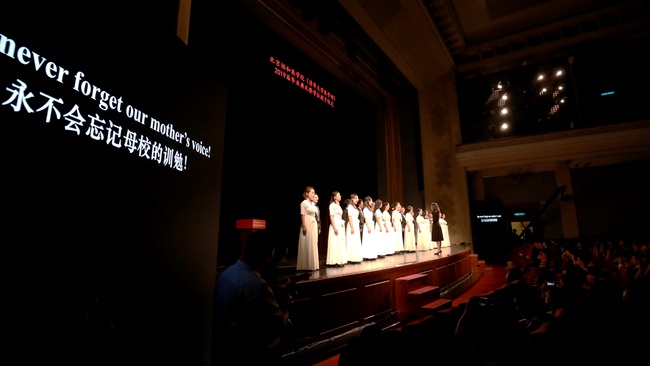 雨燕合唱团深情合唱校歌《协和颂》,以大家耳熟能详的旋律和歌声,表达了医者的责任担当和毕业生对母校的眷恋不舍。在悠扬的歌声中,2019届优秀毕业生手持象征学业表彰的“文海奖牌”,身着学位服井然有序地步入会场,重现百年协和毕业典礼的经典场景。