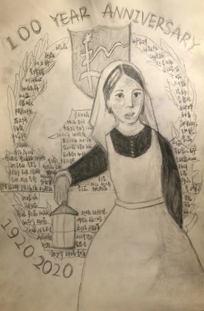 在提灯女神身后是北京协和医学院校徽,包含收集到的所有我校护理学院援鄂学长学姐们的名字,以此致敬。