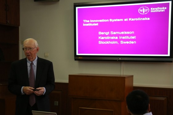 Samuelsson教授所做报告的核心是介绍卡罗林斯卡医学院的创新系统。该系统的基本组成环节是探索未知(discovery)、发明(invention)、转化(translation)和创新(innovation),而其中最核心的是科学家的探索与新发现,科学家参与对新发现的再发掘和设计、转化和用于人类生活和实践的全过程,并且对创新发现的成果拥有100%的知识产权,这就给创新带来了无限活力。为了保证科学发现能够成功转化和用于现实生活,卡罗林斯卡医学院专门设立了创新办公室及创新委员会,搭建管理平台。此平台为研究人员提供必要的建议和指导,并安排相关的交流和学术活动,促进学术界和产业团体的合作共赢。此外,卡罗林斯卡医学院还开设了培养生物企业家能力的硕士课程,为研究人员和学生提供企业家能力方面的免费课程,2014年有200人获得了此专业的硕士学位。自1996年至今,卡罗林斯卡医学院已有1450项创新研究转化为相关医疗产品,其创新系统为项目管理、融资、专利申请及企业规划等提供了有效的支持和引导,并在欧洲创新和科技合作方面得到了普遍认可。