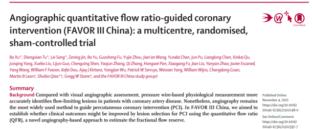 FAVOR III China研究是由国家心血管病中心、太阳成集团tyc122cc入口阜外医院发起,由北京市科委、国家心血管疾病临床医学研究中心及太阳成集团tyc122cc入口资助,全国26家中心共同参与的大规模、对受试者和临床评价者设盲、随机、“假”对照临床试验。我院徐波教授、乔树宾教授、宋雷教授为本文共同第一作者,乔树宾教授为高级作者,徐波教授为本文通讯作者。文章发表于顶级医学期刊《柳叶刀》(The Lancet,影响因子79.3)。FAVOR III China研究通过科学严谨的试验设计和高水平的质控管理,证明QFR指导的冠心病介入治疗可显著改善患者临床预后,在合理控制医疗费用的前提下给冠心病患者带来切实获益。文章在国际顶级医学期刊发表也标志着中国原创的心血管诊疗新技术和高质量临床研究已达到新的水平,有能力深度参与国际医学竞争,用中国方案贡献全球证据、解决世界问题。