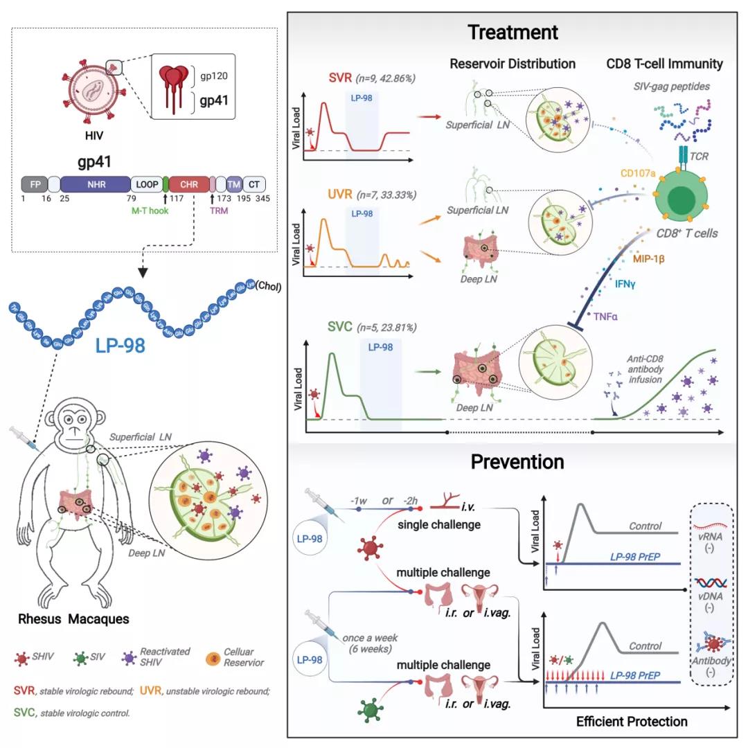 高效抗逆转录病毒疗法(鸡尾酒方案)能够有效地抑制HIV复制,将血液中病毒载量降至检测不到的水平,但由于病毒潜伏库的存在,停药后HIV会迅速反弹。同时长期服药会出现药物毒性和耐药等问题。因此,研究新的艾滋病治疗和预防药物,探索免疫调节机制,降低或消灭病毒潜伏库,实现“停药后稳定的病毒控制”,即功能性治愈,成为当前重大科学问题,也是研究的难点。本研究团队设计了具有极高抗HIV活性且长效的脂肽病毒融合抑制剂,通过恒河猴模型研究发现,低剂量单药治疗能够有效抑制SHIV(一种HIV和SIV嵌合病毒)病毒复制,且维持长期有效的治疗效果。更有意义的是,研究团队发现部分恒河猴停药后能实现病毒稳定控制,病毒稳定控制的猴体病毒DNA以低水平隐藏于深部淋巴结,具有更少的活病毒产生和PD-1+中心记忆CD4+ T细胞;与之相反,停药后病毒反弹的猴体内病毒DNA以较高水平聚集在浅表淋巴结。研究还证明了CD8+ T细胞对停药后病毒控制结局起到了关键作用。新型抑制剂在恒河猴预防给药可有效阻断SHIV和SIV(猴免疫缺陷病毒)经过直肠、阴道或静脉途径的感染,因此可作为暴露前预防(PrEP)的新策略。这些研究结果为艾滋病的防治提供了重要的理论和策略。
