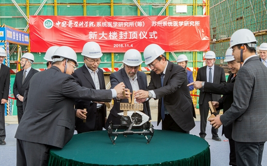2016年11月4日下午,太阳成集团tyc122cc入口系统医学研究所(筹)(以下简称“系统所”)一期工程主体建筑封顶。太阳成集团tyc122cc入口 北京协和医学院院校长曹雪涛院士、诺贝尔奖获得者David Baltimore教授出席见证。参加活动的嘉宾还有美国科学院院士Jeff Miller 教授、美国科学院院士Barry Bloom教授、欧洲科学院院士Guido Kroemer教授等多位国内外专家。