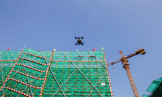 在主持人的邀请下,曹雪涛院校长和David Baltimore教授等7位嘉宾将象征着封顶的“金砖”准确的放入3D打印的无人机运输框内。在现场嘉宾、系统所员工和建设单位代表的欢呼声中,无人机承载着3D打印的“金砖”飞往楼顶“添砖加瓦”,系统所一期工程主体建筑顺利封顶。