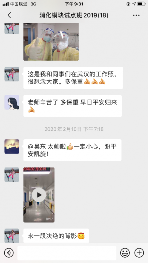 “疫情告急,武汉全程封闭,进入紧急状态!“似乎任何与武汉相关的字眼都会让人心中一紧。呼吸模块儿微信群里弹出一条消息:同学们,我们的孙雪峰老师主动请缨,明天就奔赴武汉!紧接着,一张协和援鄂医疗队的图片发了过来。没错,就是那个黑黑皮肤的亲切笑脸。虽然带着口罩,但是那双笑眯眯的眼睛,仿佛就像讲台上给我们上课时那样愉悦而又从容。但我们心里都沉甸甸的,因为武汉不是讲台,而是战场!随后,消化模块群一组照片发过来,是很多全副武装的医护人员在走廊里走着,我们猜到是协和医疗队已经抵达最前线。突然,一位防护服上“吴东”二字跃入眼帘。我顿时觉得自己完全愣住了,抓起手机:吴老师,您是消化科医生呀,为什么去驰援武汉?很快,有了回音:“怎么看不起我?以前学过重症处理,嘿嘿……”吴老师幽默的调侃着。我还在这边絮絮叨叨地说专业不太对口…… “还记得之前和你们讲的医生的基本素养吗?国家有难,作为一个医生,我有专业技术和能力,那就要义不容辞,没有所谓的是否可以或需要。这是作为一个医生的职责所在。”