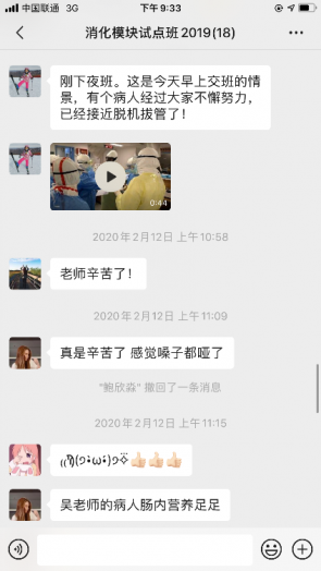 居家隔离的日子里,在认真学习理论知识之余,我们深深惦念着两位前线的师长。两位老师在紧张工作之余,仍然与我们分享前线的工作与生活。虽然厚重的防护服让人看着就窒息,但是透过屏幕,我们能感受到老师们的喜悦与兴奋,我相信老师们如此的乐观态度是他们发自内心的对工作的热情与对患者的责任。