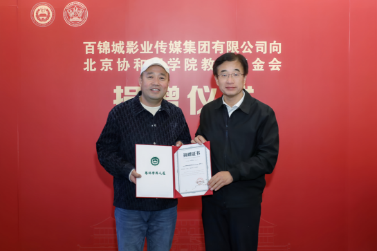2024年12月5日,百锦城影业传媒集团有限公司(简称“百锦城集团”)向校基金会捐赠仪式在院校九号院举行,捐赠资金将用于支持院校教育、医疗、科研事业的发展。