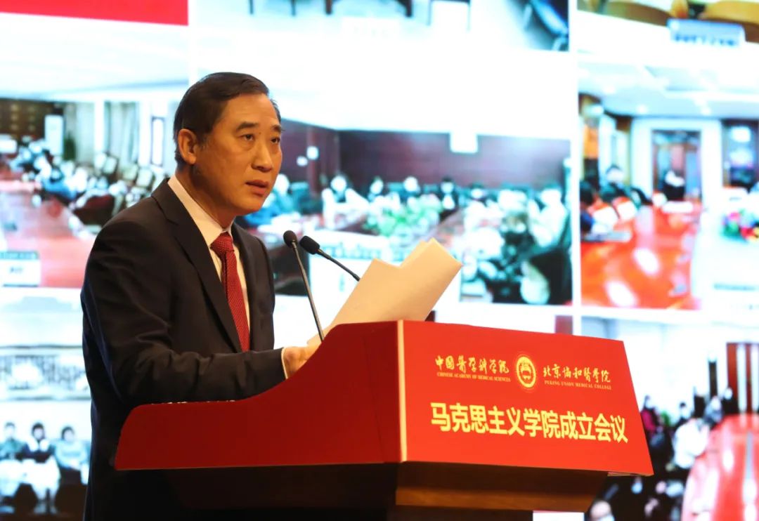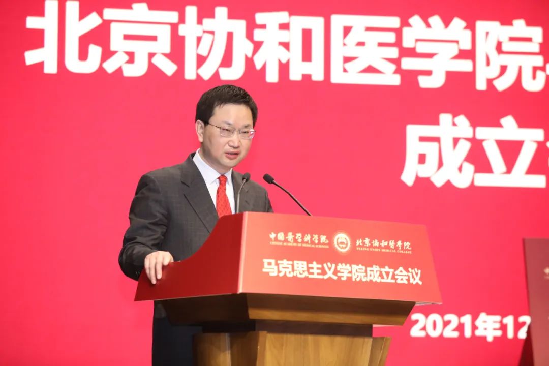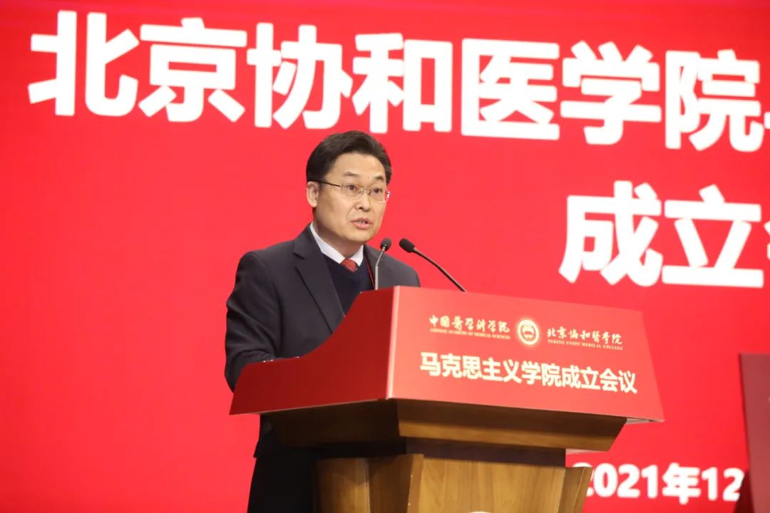 国家卫生健康委副主任曾益新致辞强调,马克思主义学院要在政治引领、开放办院、协同育人、服务社会上下功夫,聚焦马克思主义在卫生健康领域的运用规律研究,健全以马克思主义为指导的中国特色医学人文学科建设,发挥最高医学研究机构和最高医学教育机构的示范引领作用,坚持政治建院,人才强院,管理兴院,坚决扛起政治责任和社会责任,坚持“马院姓马,在马言马”的政治导向和办学原则,努力建成一流的马克思主义学院。